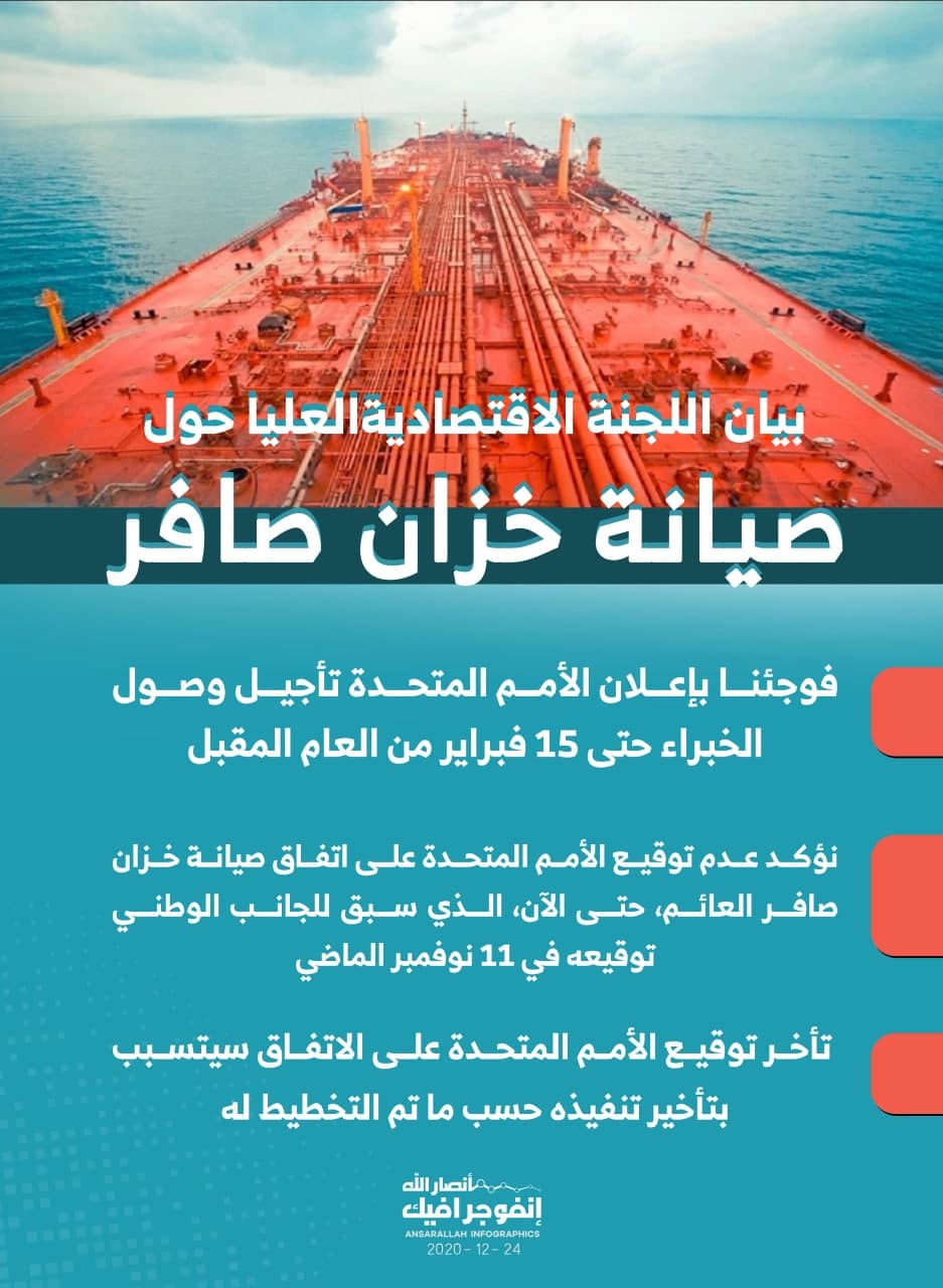 وكانت الأمم المتحدة أعلنت تأجيل وصول الخبراء المكلفين بصيانة خزان صافر حتى 15 فبراير من العام المقبل.