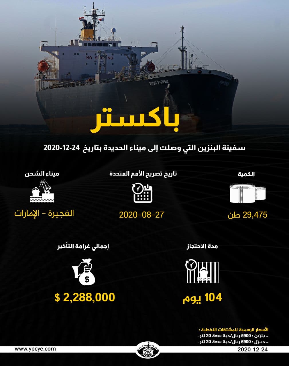 وقالت شركة النفط في بيان صادر عنها، أن السفينة “باكستر” التي وصلت اليوم إلى ميناء الحديدة محملة بكمية (29,475) طن من مادة البنزين.