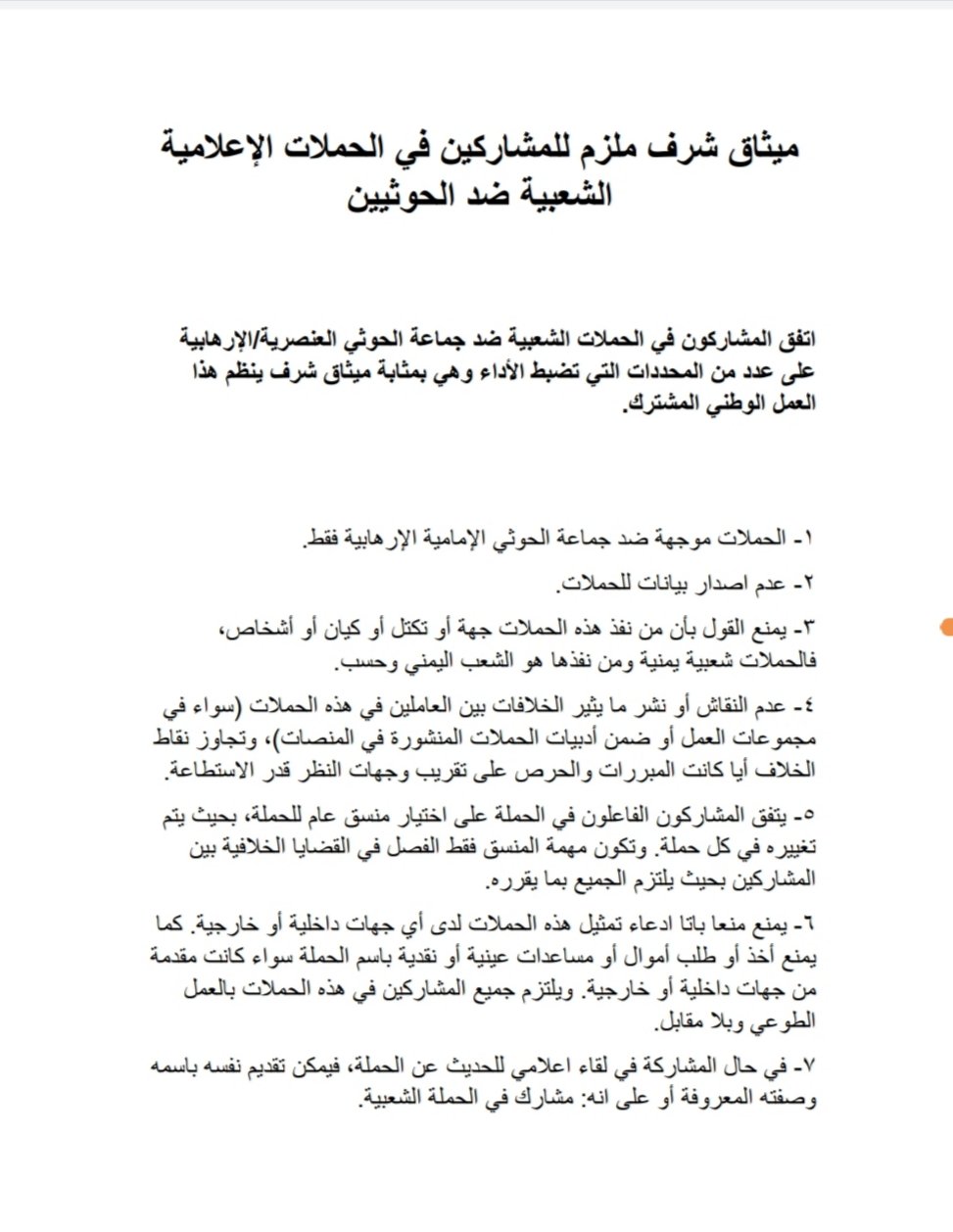 ويدعو الميثاق أيضاً إلى أن يتم إطلاق حملات وتكون ضد أنصار الله فقط، وأن يتم تعميمها على أن يقال أنها حملات شعبية يمنية.