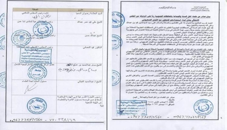واعتبر العلماء تلك التصريحات امتداداً لتصريحات ما يسمى رئيس المجلس الانتقالي عيدروس الزبيدي الذي أبدى استعداده التطبيع مع الكيان الصهيوني.