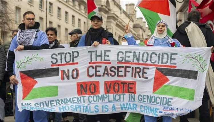نظم عاملو القطاع الصحي بالعاصمة البريطانية لندن، مسيرة صامتة احتجاجًا على العدوان الصهيوني على قطاع غزة.