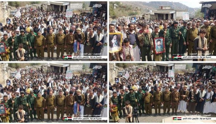 خرجت بمحافظة المحويت اليوم الجمعة، عشر مسيرات جماهيرية تضامنا مع الشعب الفلسطيني تحت شعار “مع غزة ملتزمون حتى النصر”.