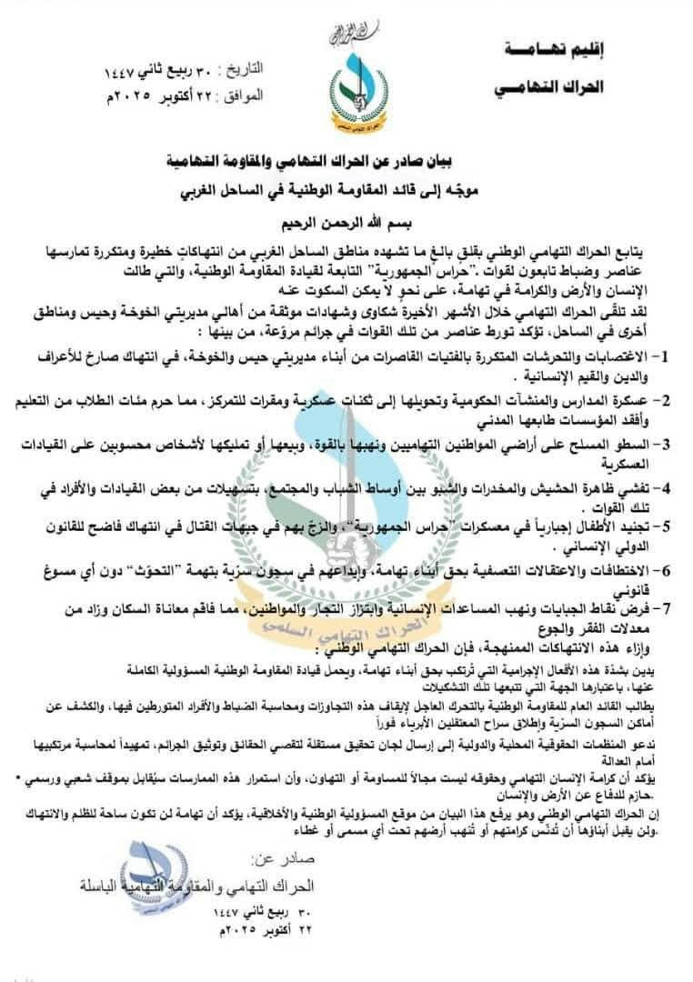 حيث أعرب البيان عن قلقه إزاء ما تشهده مناطق تهامة من ممارسات تطال ما وصفها بـ “الإنسان والأرض والكرامة”، مؤكداً أن الحراك تلقى شكاوى وشهادات موثقة خلال الأشهر الأخيرة من أهالي مديريتي الخوخة وحيس ومناطق أخرى.
