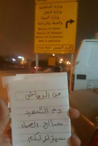 كما توعد احد المواطنين بالمملكة بالانتقام على اغتيال الرئيس الشهيد صالح الصماد، وكتب في رسالة بعثها من احد شوارع الرياض : ” دم الشهيد صالح الصماد سيزلزلكم”