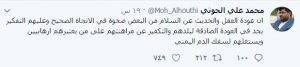 دعا رئيس اللجنة الثورية العليا محمد علي الحوثي في تدوينة له على حسابه في تويتر  مرتزقة الرياض إلى التفكير بجد في العودة الصادقة لبلدهم والتكفير عن مراهنتهم على من يعتبرهم إرهابيين ويستغلهم لسفك الدم اليمني”.
