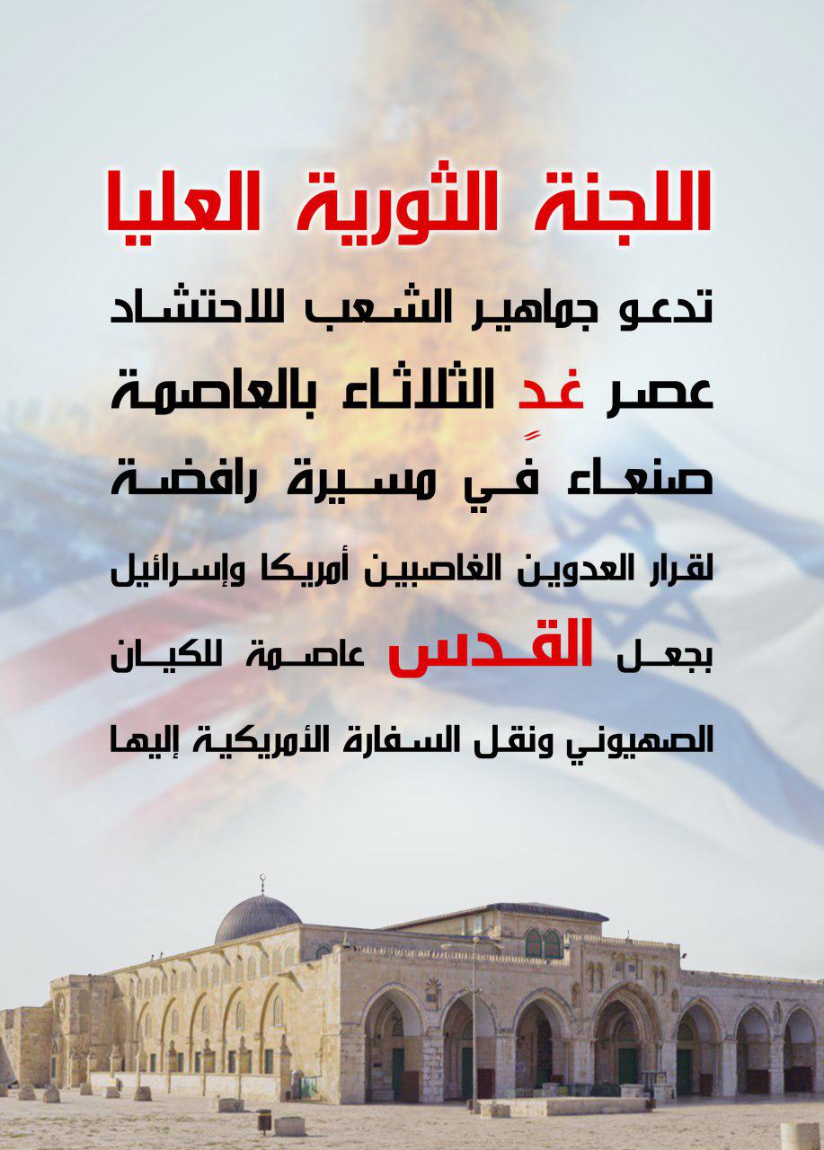 ندعوجماهير الشعب اليمني إلى مساندة الاخوةفي فلسطين بالخروج للتظاهرعصر غد ضد العدوين الغاصبين أمريكاوإسرائيل الذين قرراالقدس عاصمةللكيان الغاصب وندعو الشعوب للتحرك الشعبي الجاد في كل العواصم الإسلامية ونهيب بكل الحركات والمنظمات الشعبيةاتخاذخطوات جاده وعمليه لاستنقاذ قبلتهم الأولى