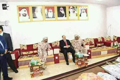 وتناقل ناشطون على مواقع التواصل الاجتماعي بتويتر , صورا لهادي مع ضباط إماراتيين في قصر المعاشيق بعدن ، بوضع يظهر رخص هادي