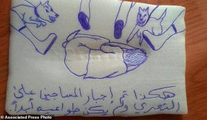 “عراة بعد الضرب” ، يقول تعليق عربي. رسم آخر يبين أن رجلاً مستقيماً يُجبر على “التفريج بين رجليه”. “هذه هي الطريقة التي يفتشون بها السجناء” ، تقول التسمية التوضيحية.
