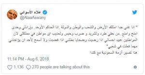 ودون “الأسواني” في تغريدة له عبر حسابه بتويتر رصدتها (وطن) ساخرا من “ابن سلمان” ومفسرا من وجهة نظره أزمة السعودية مع كندا:”انا غنى جدا امتلك الأرض والشعب والوطن والدولة .انا الحاكم الأوحد. بإرادتي وحدى امنح وامنع من حقي طرد وتشريد و ضرب وحبس وتعذيب اى مواطن في مملكتي”