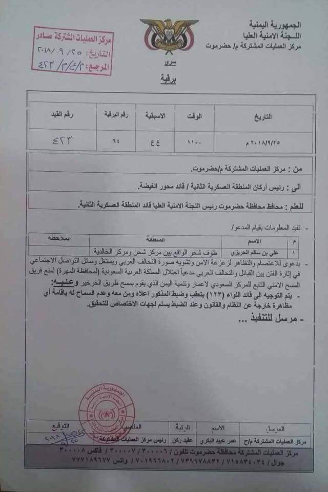ووجه مشائخ وأعيان المحافظة رسالة شديدة اللهجة إلى قوات التحالف يحذرون فيها من المساس بالشيخ علي سالم الحريزي وكيل محافظة المهرة ، الذي أقلق السعودية والإمارات من التفاف المواطنين حوله بعد تزعمه الاحتجاجات الشعبية الغاضبة في المهرة ولما يتمتع به مهارة في الخطابة السياسية والمهارات العسكرية.