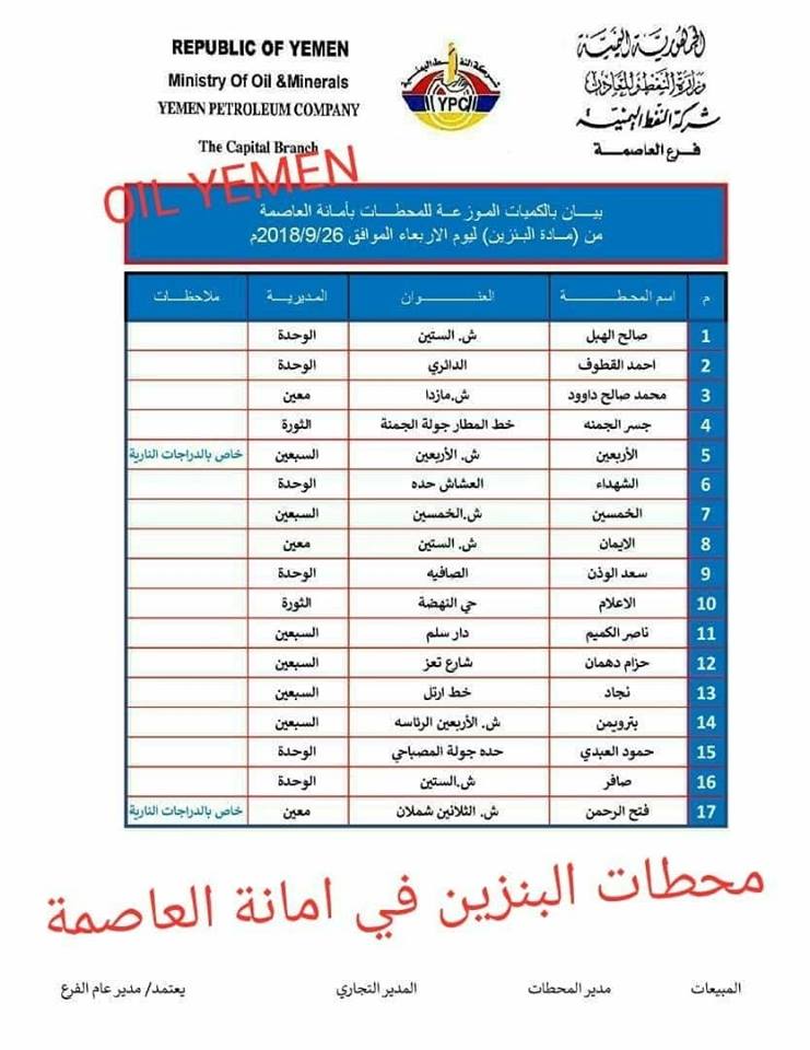 شركة النفط اليمنية تكشف عن أسماء المحطات التي تم تزويدها بمادة البنزين في أمانة العاصمة ليوم غدا الاربعاء On سبتمبر 26, 2018 Share يمني برس // نشرة شركة النفط اليمنية كشف بأسماء المحطات التي تم تزويدها بمادة البنزين بأمانة العاصمة ليوم غدا الاربعاء الموافق 26 سبتمبر 2018م. Share