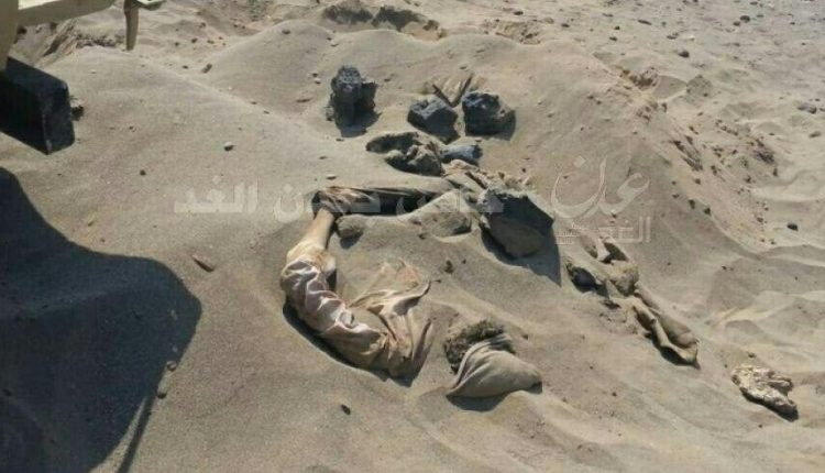 ونشرت صحيفة عدن الغد صورة للجثث التي تم العثور عليها وهي مدفونة بداخل المنطقة المذكورة وسط كثبان رملية.