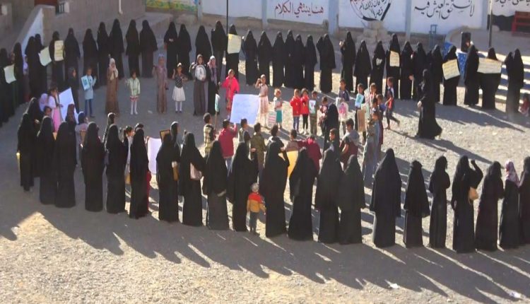 نظمت الهيئة النسائية الثقافية العامة لأنصار الله بمحافظة البيضاء اليوم وقفة نسائية بمديرية رداع استنكارا لجريمة العناصر الاستخباراتيه المسماة داعش بحق اربعة مواطنين تم اعدامهم بدون حق وبطريقة وحشية بمنطقة يكلا .