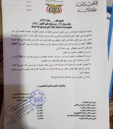 وقضى التعميم الصادر اليوم الأثنين 14 يناير 2019م، بتنزيل المنقطعين والمتغيبين عن العمل وتوريد الاستقطاعات القانونية لماسيتم صرفه عن الـ(50%) من الراتب والبدلات والتي سيتم صرفها فقط وفقاً للإجراءات القانونية وألا يتضمن الصرف أي مبالغ كانت تصرف تحت مسمى حوافز شهرية أو أي مسمى كان حتى وإن كانت قوانين ولوائح الجهة تتضمن ذلك وسيتم اتخاذ الإجراءات القانونية للازمة تجاه الجهات التي ستقوم بمخالفة ذلك.