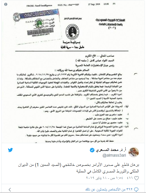 نشر المعارض السعودي محمد المسعري “وثيقة مسربة” من الديوان الملكي السعودي موجهة للمخابرات المصرية، كشفت عن الدور المصري في التنسيق مع الفريق الأمني السعودي لاغتيال الصحفي جمال خاشقجي في أكتوبر الماضي.