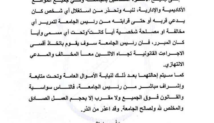 وجاء في المذكرة الممهورة بتوقيع رئيس الجامعة ” سيتم إحالة المخالف والمدعي الانتهازي إلى نيابة الأموال العامة واتخاذ ما من شأنه ردعهما عن تجاوز القوانين واللوائح الخاصة بجامعة صنعاء”