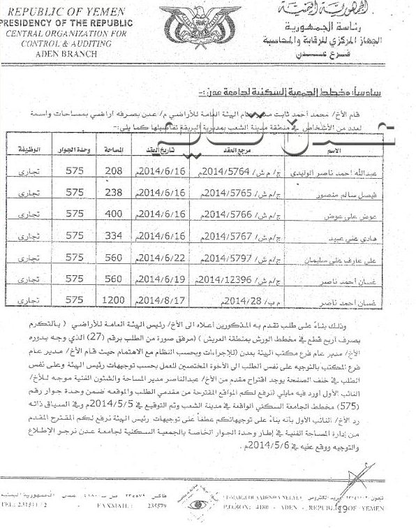 وبحسب التقرير قام مدير الأراضي بصرف صرف مساحات واسعة من الأراضي التجارية لعدد من الأشخاص في منطقة مدينة الشعب بمديرية البريقة، خلال العام 2014م، وهم: عبدالله احمد ناصر الوليدي، فيصل سالم منصور، عوض علي عوض، هادي علي عبيد، علي عارف سليمان، غسان احمد ناصر( 1760متر).