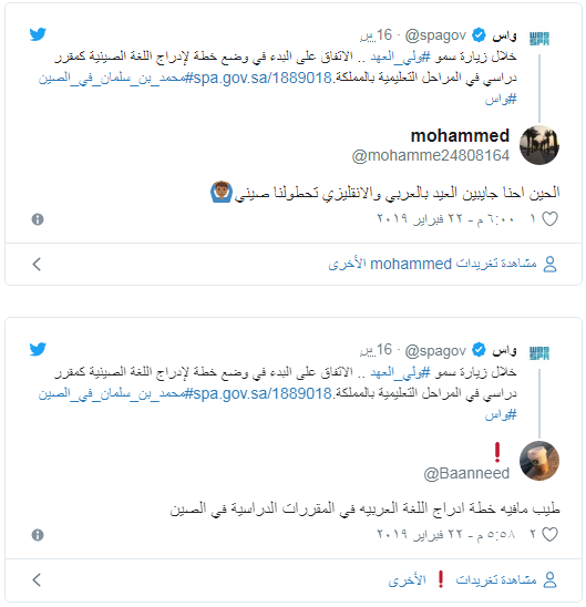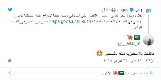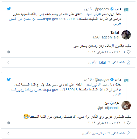 ولاقى الخبر الذي نشرته “واس” عبر حسابها بموقع “تويتر” سخرية واسعة بين المغردين، الذين شددوا على ضرورة تعليم الطلاب اللغة العربية أولا قبل أن يتم اتخاذ مثل هذه القرارات، في حين تساءل آخرون إن كان قد تم إقرار اللغة العربية في المدارس الصينية.