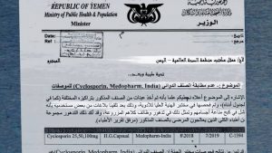 يشير ناطق الصحة إلى أن قيادة الوزارة طالبت منظمة الصحة العالمية بتوضيح كامل بشأن عدم فعالية صنف السيكلوسبورين ، فضلا عن الالتزام ببرتوكولاتها التي تنظم تأمين الأدوية وبحسب وزارة الصحة العامة والسكان تخالف منظمة الصحة العالمية بروتوكولاتها التي تحتم ارفاق أي صنف دوائي بعدد من الوثائق كشهادة اثبات ترخيص تصنيع الدواء وتسويقه واستخدامه في بلد المنشأ وملفي مأمونية الدواء الدورية ودراسة التكافؤ الحيوي وقد حصلنا على نسخ من المذكرات الرسمية للصحة والتي تفاعلت معها المنظمة على الورق واقترحت تشكيل لجنة مشتركة من الجانبين كما تفيد مذكرة رسمية صادرة عن المنظمة …
