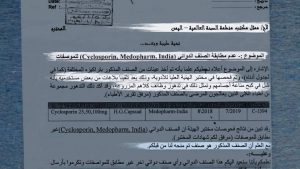 في التحقيق بحثنا مع الهيئة العليا للأدوية والمستلزمات الطبية شكاوي زارعي الكلى فتبين أنها اخضعت لفحص مختبرها عينات عشوائية من صنف السيكلوسبورين هندي المنشأ وهو أحد أدوية تثبيط المناعة التي أمنتها منظمة الصحة فأكدت النتائج شكاوى المتضررين كما أشار لذلك رئيس الهيئة الدكتور محمد المداني الذي وضع بين أيدينا شهائد المختبر التابع للهيئة أيضا ” تم إحالة عينات من صنف السيكلوسبورين للفحص والتحقق من أمانة وجودة المنتج ، ففشل المنتج في تجاوز الاختبارات في المختبر الوطني للرقابة الدوائية ” ويتابع المداني “عملنا مذكرة إلى وزارة الصحة والى منظمة الصحة العالمية بإيقاف صرف مثل هذا الدواء وتم التحفظ على الكمية وتم ايقافها ،،، أبلغنا المنظمة وابلغنا الوزارة بان المنتج أثبت أنه فاشل وبأن هذا الموضوع يعتبر خطير جدا ”