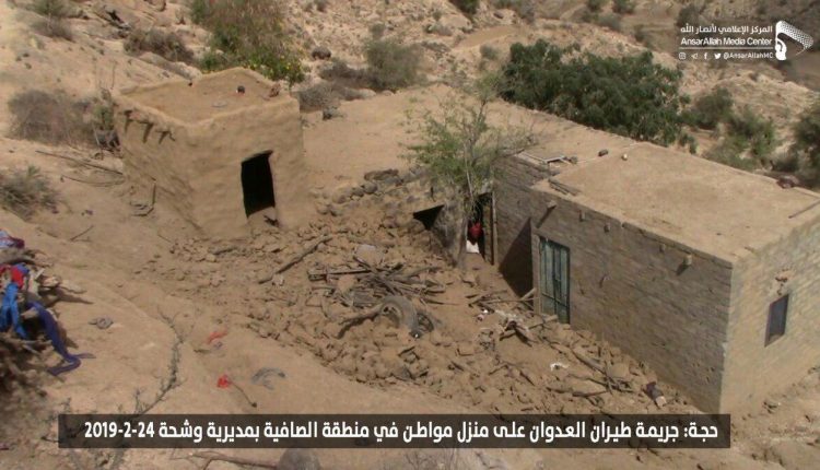 وفي محافظة حجة استشهد مواطنين اثنين ظهر اليوم اثر استهداف طيران العدوان الأمريكي السعودي منزل المواطن محمد محسن يحي العزي في منطقة الصافية بعزلة بني رزق بمديرية وشحة بحجة