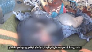 واوضح مركز عين الإنسانية للحقوق والتنمية ان طائرات العدوان قامت بقصف منزل المواطن أحمد علي المؤيد في الساعة 12 ظهرا الكامن في قرية الصافية – عزلة بني رزق – مديرية وشحة بمحافظة حجة حيث سقط على اثرها شهيدا مع شهيد اخر من أقاربه ولازال البحث جاري عن طفلته الذي الى حد الان لازالت مفقودة بين الركام ..