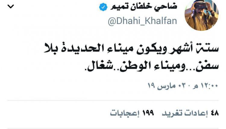 وكتب خلفان على حسابه في تويتر أن الامارات تهدف الى تعطيل ميناء الحديدة في مقابل تشغيل ميناء دبي.