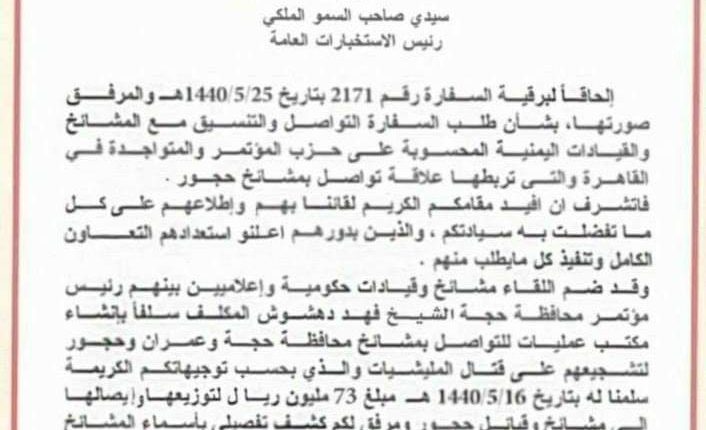 وبحسب الوثيقة التي نشرها موقع الخبر اليمني والصادرة بتاريخ 21 جماد الاخرة عطفا على مذكرات سابقة فإن السفير السعودي في القاهرة التقى مشايخ ووجهاء وقيادات حكومية تابعة للشرعية على رأسهم الشيخ المرتزق فهد دهشوش رئيس ما يسمى بفرع المؤتمر في محافظة حجة ووجهم بتنفيذ أوامر السعودية ومخططاتها.