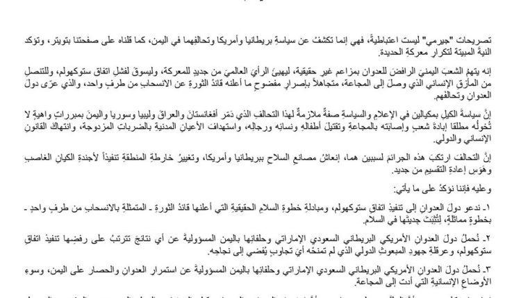 2ـ نُحملُ دولَ العدوانِ الأمريكي البريطاني السعودي الإماراتي وحلفائِها باليمن المسؤوليةَ عن أي نتائجَ تترتبُ على رفضِها تنفيذ اتفاقِ ستوكهولم، وعرقلةِ جهودِ المبعوثِ الدولي الذي لم تمنحْه أيَ تجاوبٍ يُفضي إلى نجاحِه