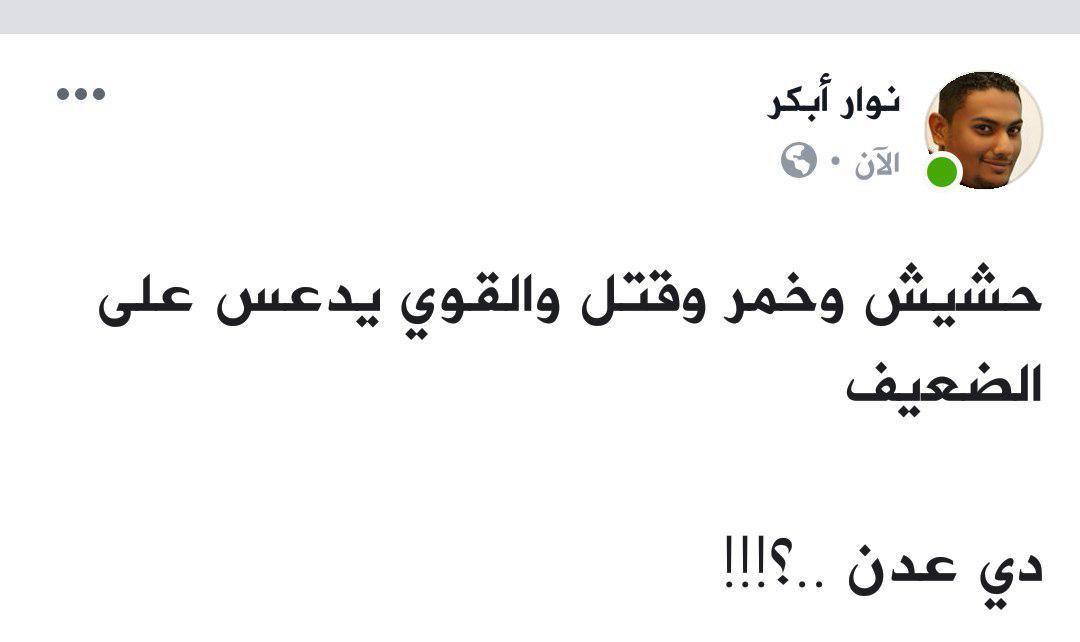 وقال الناشط الجنوبي نوار أبكر في منشور له على صفحته في الفيس بوك ” حشيش وخمر وقتل والقوي يدعس الضعيف دي عدن”