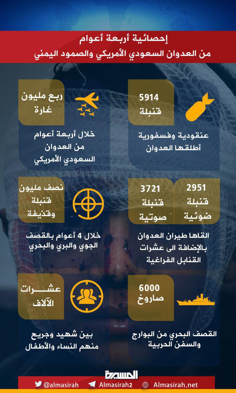 كما أكد أنه خلال 4 أعوام سقط على اليمن أكثر من نصف مليون قنبلة وقذيفة صاروخية كبيرة ومتوسطة بالقصف الجوي والبري والبحري، موضحا أن طيران العدوان ألقى على اليمن ما يزيد على مائتين وخمسين ألف قنبلة صاروخية، كما تم رصد ما لا يقل عن 5914 قنبلة عنقودية وفوسفورية أطلقها العدوان على عدد من المحافظات.
