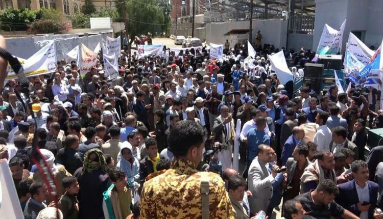 نظمت شركة النفط اليمنية اليوم مسيرة ووقفة احتجاجية أمام مكتب الأمم المتحدة بالعاصمة صنعاء .