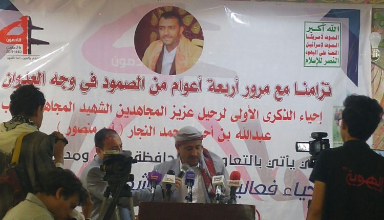 نظمت أسرة آل النجار بالتعاون مع مديريه سنحان ومحافظة صنعاء بمنطقة حزيز عصر اليوم الخميس فعالية خطابية وانشادية في الذكرى الأولى لاستشهاد المجاهد النقيب عبدالله النجار بالتزامن مع مرور أربعة أعوام من الصمود بوجه العدوان بحضور رسمي وشعبي كبير.