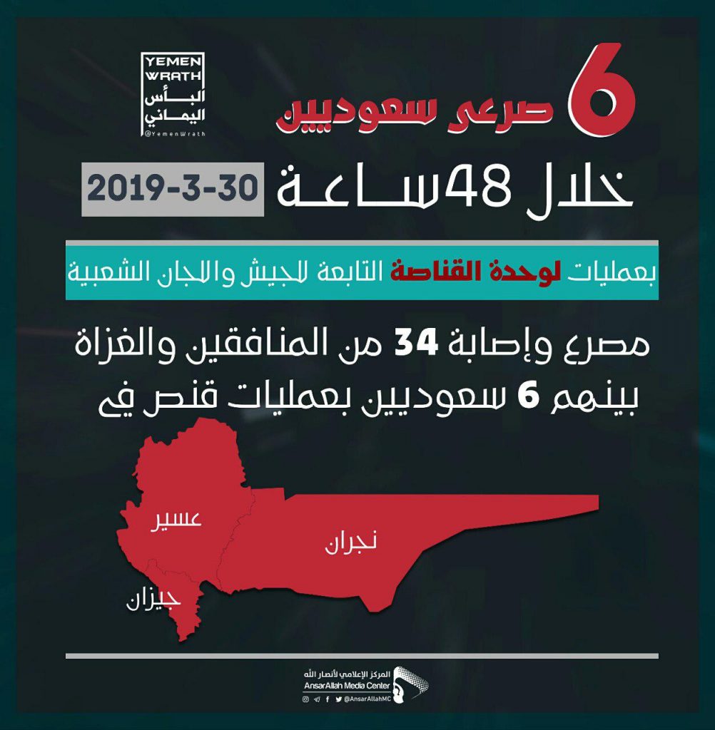اليوم بالإنفوجرافيك.. مصرع وإصابة 34 من المنافقين والغزاة بينهم 6 سعوديين بعمليات قنص في جبهات الحدود يمني برس - إنفوجرافيك اليوم بالإنفوجرافيك.. مصرع وإصابة 34 من المنافقين والغزاة بينهم 6 سعوديين بعمليات قنص في جبهات الحدود On مارس 30, 2019 Share الجيش واللجان الشعبيةالعدوان على اليمنالمرتزقةجيزانعسيرنجران Share