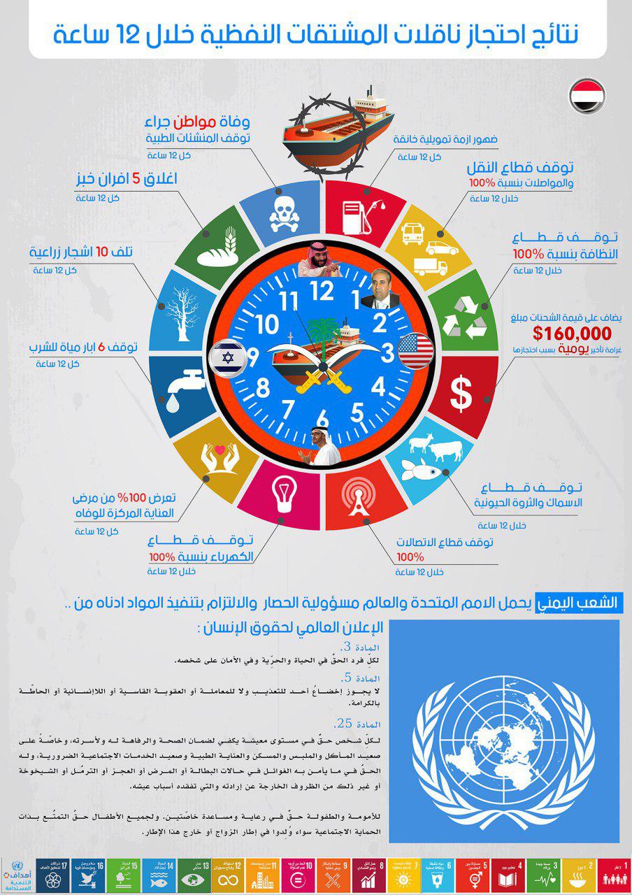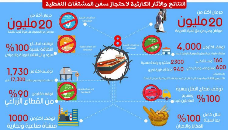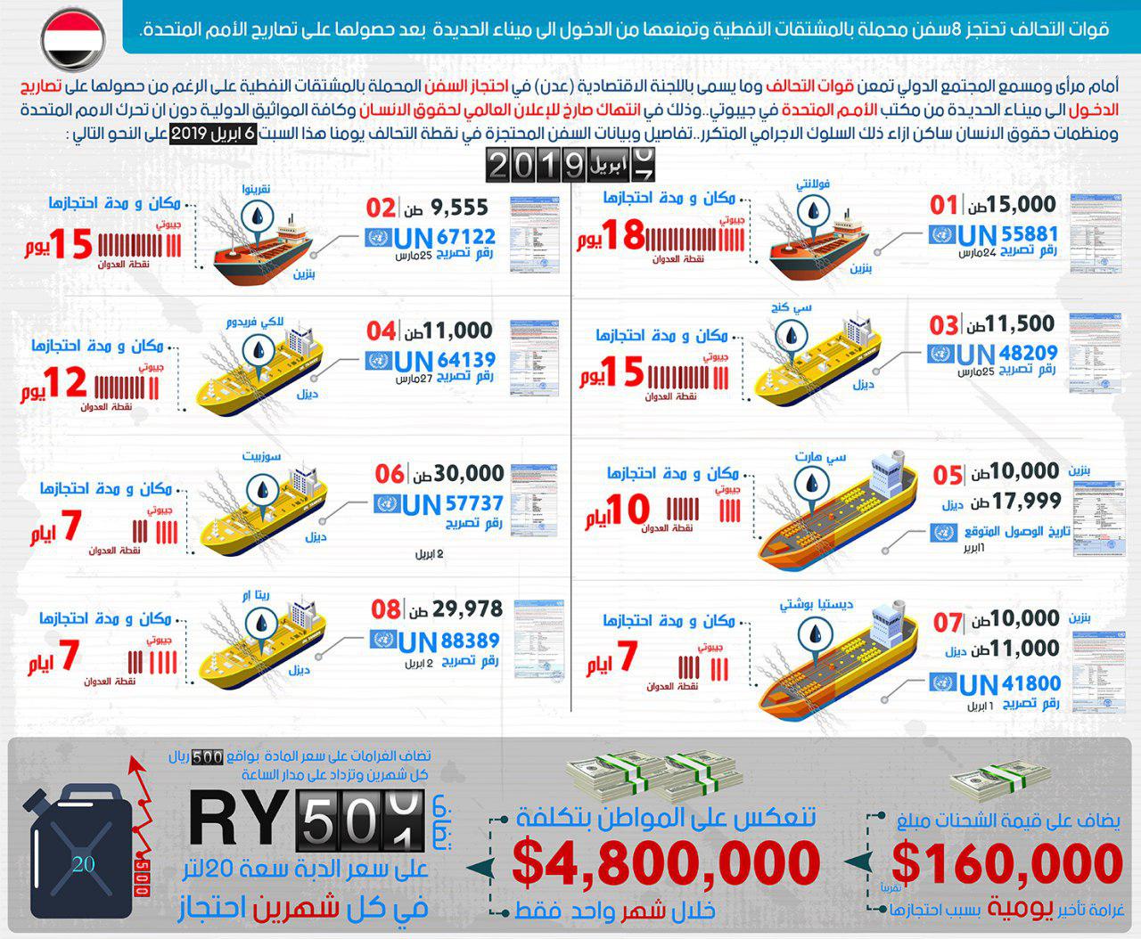 انفوجرافيك| العدوان يحتجز 8 سفن نفطية ويمنع دخولها ميناء الحديدة . On أبريل 8, 2019 Share يمني برس – انفوجرافيك النتائج والآثار الكارثية لاحتجاز سفن المشتقات النفطية نتائج احتجاز ناقلات النفطية خلال 12ساعة Share