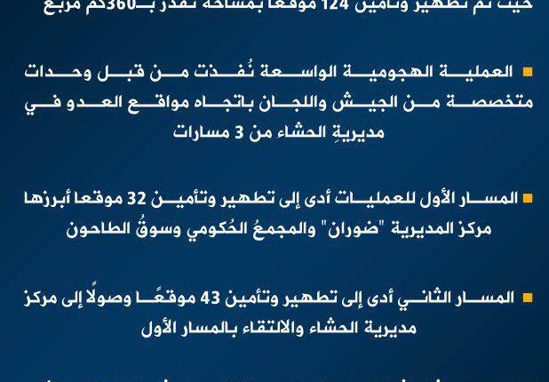 وأفاد أن المسار الأول للعمليات أدى إلى تطهير وتأمين 32 موقعا أبرزها مركز المديرية “ضوران” والمجمعُ الحُكومي وسوقُ الطاحون، أما المسار الثاني فأدى إلى تطهير وتأمين 43 موقعًا وصولًا إلى مركز مديرية الحشاء والالتقاء بالمسار الأول.