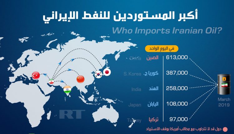 ووفقا لبيانات وكالة “بلومبرغ” بأهم زبائن النفط الإيراني وفق مارس 2019، هي الصين التي تحتل المرتبة الأولى باستيرادها لــ 613 ألف برميل يومياً، في حين تحتل كوريا الجنوبية المرتبة الثانية بـ 387 ألف برميل، يليها الهند التي تستورد ما يقارب 258 ألف برميل يومياً، واليابان 108 ألف برميل يومياً وتركيا97 ألف برميل في اليوم الواحد.. علما أن البيانات تظهر أن سوريا وأوروبا لم تشتريا أي نفط من إيران في هذه الفترة، ما يعني أن القرارات الامريكية لن يكون لها تأثير كبير على الاقتصاد الايراني