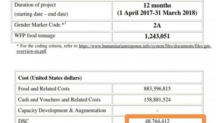 وتوضح الوثيقة وهي جزء من تقرير للمنظمة الأممية يتعلق بمشروع توزيع مساعدات غذائية خلال الفترة (أبريل 2017 – مارس 2018) بتكلفة إجمالية تبلغ ما يقارب مليار و200 مليون دولار أمريكي، أنه تم تخصيص 50 مليون دولار تقريباً لتوظيف 8 موظفين ودفع رواتبهم خلال فترة تنفيذ المشروع وهي عام واحد فقط.