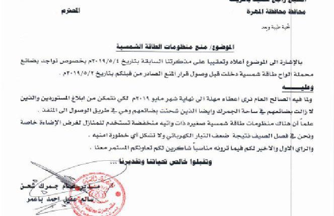 واشارت وثيقة صادرة عن ادارة جمارك منفذ شحن الى صدور قرار يقضي بمنع استيراد منظومة الطاقة الشمسية، دون ذكر الاسباب .