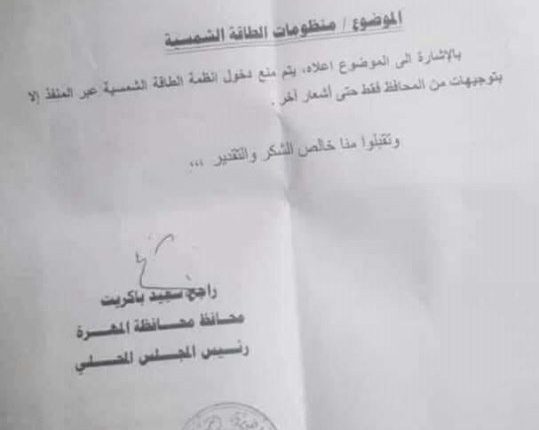 بإيعاز من دول العدوان وجه المدعو “راجح بن كريت” المعين من العدوان محافظا لمحافظة المهرة قراراً بمنع دخول أنظمة الطاقة الشمسية إلى كافة مديريات المحافظة من منفذ شحن البري.