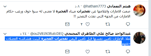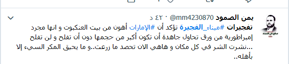 في حين قال مغرد اخر بأن تفجيرات #ميناء_الفجيرة تؤكد أن #الإمارات أهون من بيت العنكبوت و انها مجرد إمبراطورية من ورق تحاول جاهدة أن تكون أكبر من حجمها دون أن تفلح و لن تفلح …نشرت الشر في كل مكان و ها هي الان تحصد ما زرعت.. و لا يحيق المكر السيء إلا بأهله..