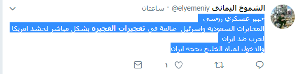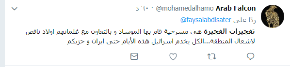 في حين عبر مغرد تحت إسم “خبير عسكري روسي” أن المخابرات السعودية وإسرائيل  ضالعة في تفجيرات الفجيرة بشكل مباشر لحشد امريكا لحرب ضد ايران والدخول لمياه الخليج بحجه ايران.