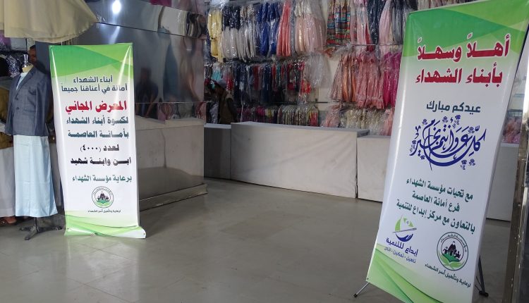 افتتحت مؤسسة الشهداء بأمانة العاصمة اليوم الأربعاء 10 رمضان 1440هـ 15 مايو 2019م معرض للملابس لتوزيع كسوة العيد لجميع أبناء وبنات الشهداء بأمانة العاصمة والذي يتجاوز عددهم عن 4 آلاف (إبن – وإبنة) شهيد.