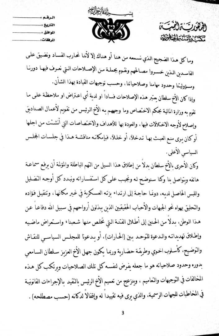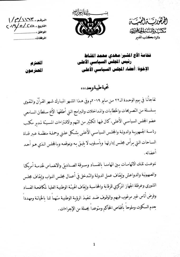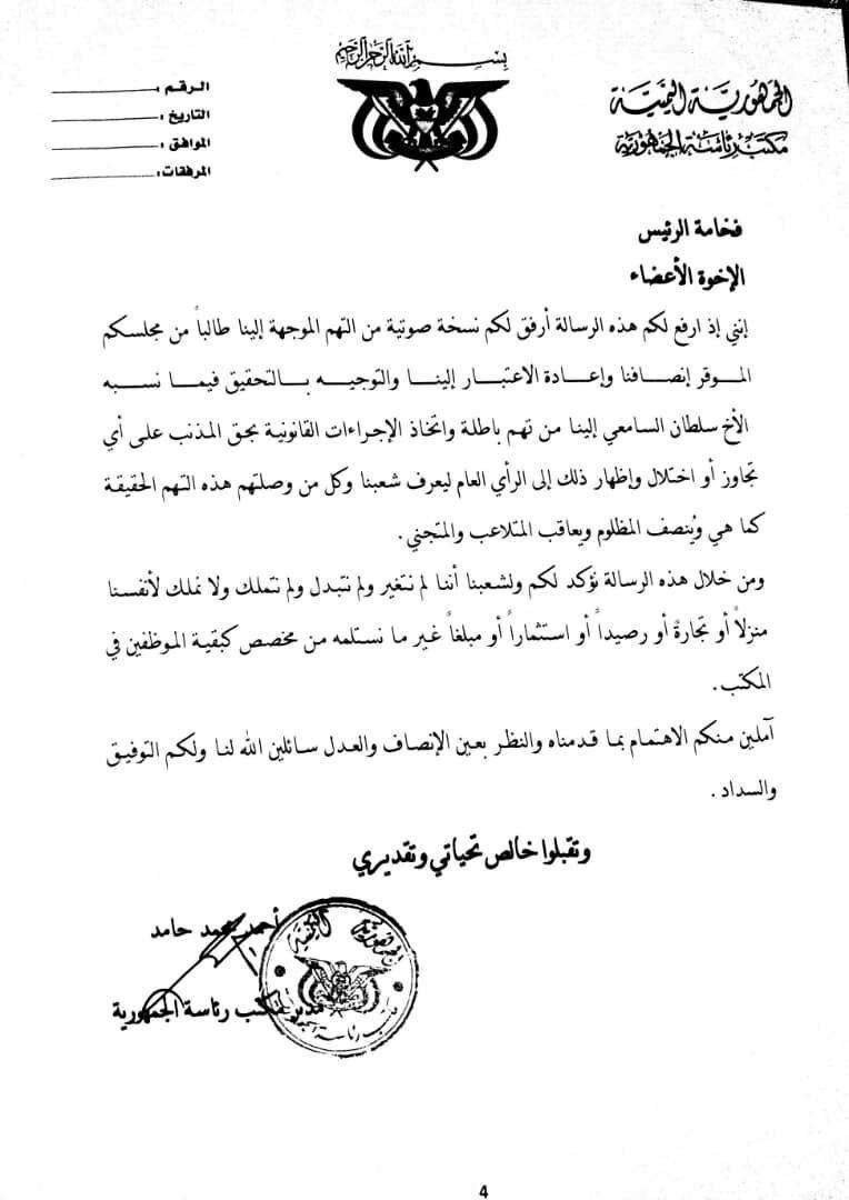 وقال مدير مكتب رئاسة الجمهورية أحمد حامد في رسالته رئيس المجلس السياسي الأعلى واعضاء المجلس: ” إنني إذ ارفع لكم هذه الرسالة أرفق لكم نسخة صوتية من التهم الموجهة إلينا طالباً من مجلسكم الموقر إنصافنا وإعادة الاعتبار إلينا والتوجيه بالتحقيق فيما نسبه الأخ سلطان السامعي إلينا من تهم باطلة واتخاذ الإجراءات القانونية بحق المذنب على أي تجاوز أو اختلال وإظهار ذلك إلى الرأي العام ليعرف شعبنا وكل من وصلتهم هذه التهم الحقيقة كما هي ويُنصف المظلوم ويعاقب المتلاعب والمتجني”.
