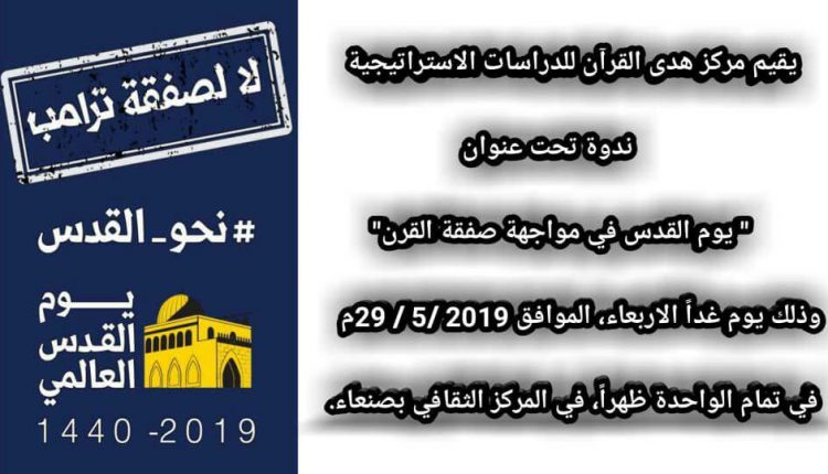 “يوم القدس في مواجهة صفقة القرن” في ندوة موسعة ظهر غد الأربعاء بصنعاء
