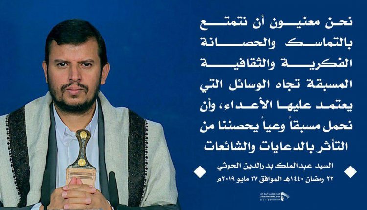 وشدد السيد عبدالملك الحوثي على ضرورة التماسك والحصانة الفكرية والثقافية المسبقة تجاه الوسائل التي يعتمد عليها الأعداء، منوهاً الى أن حمل الوعي المسبق يحصن المجتمع من التأثر بالدعايات والشائعات