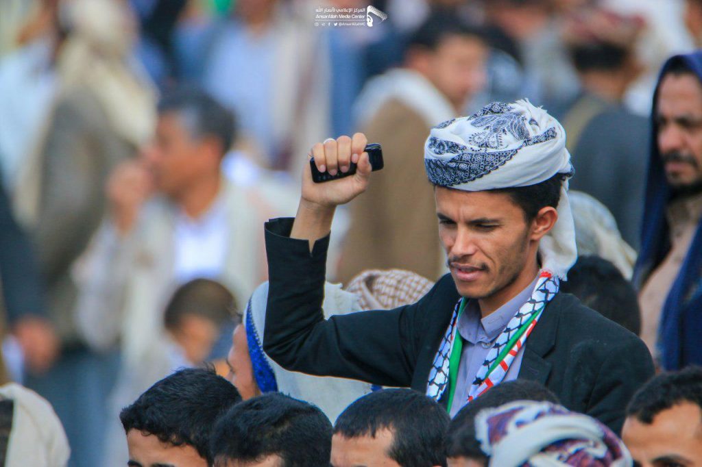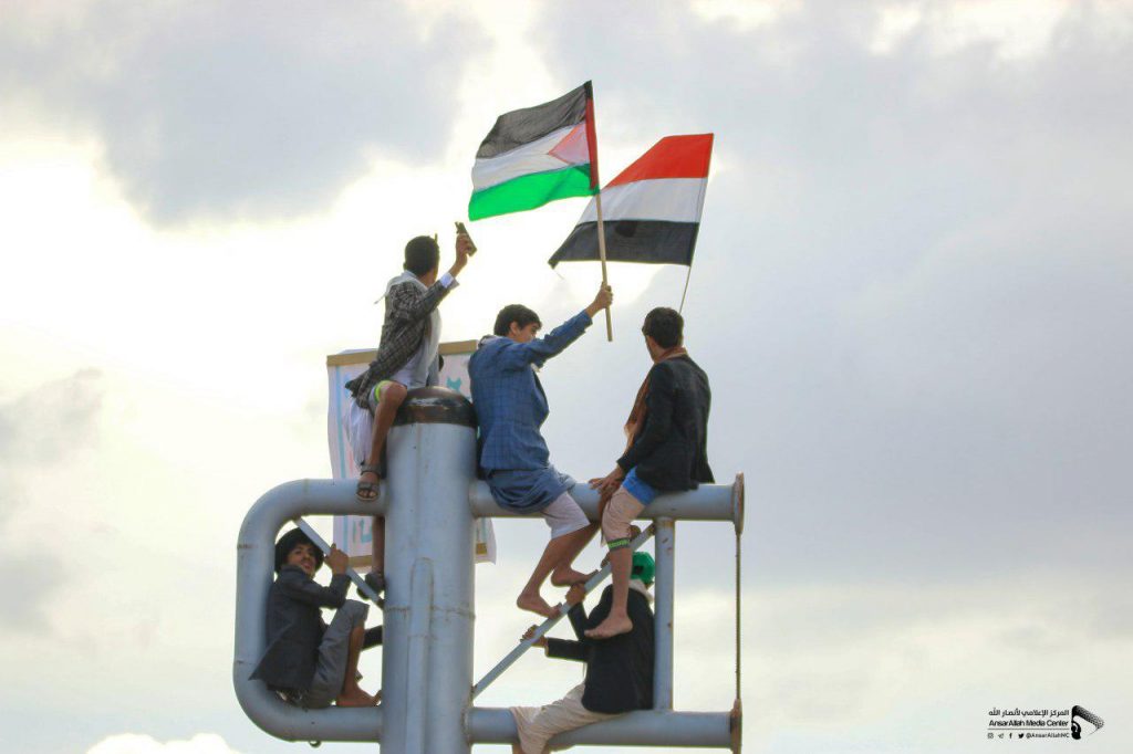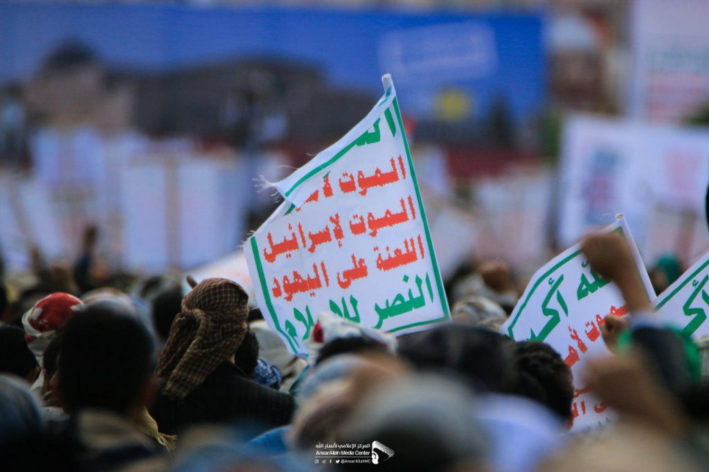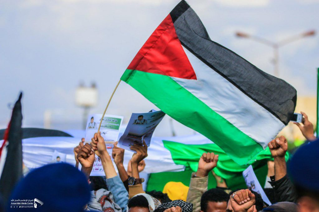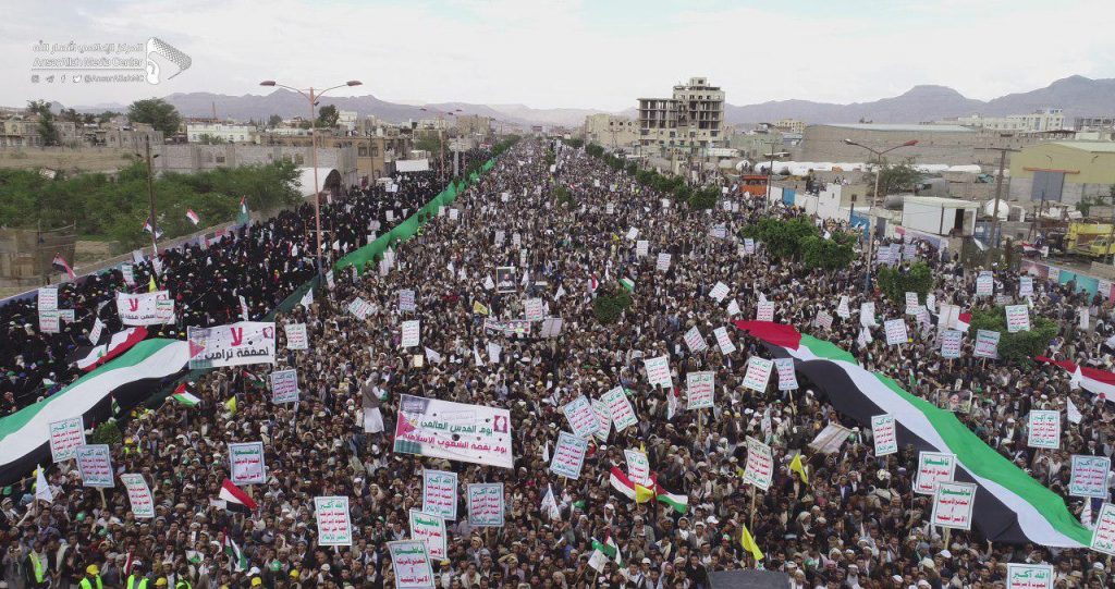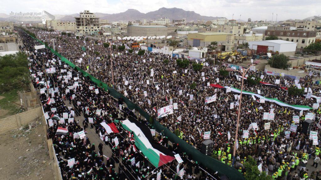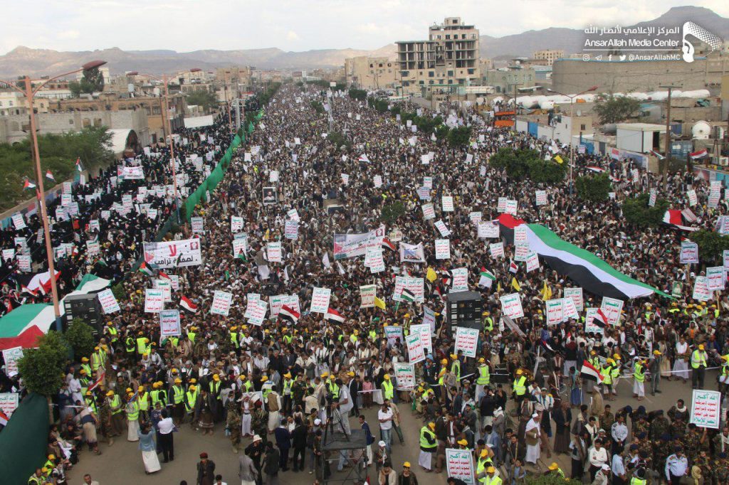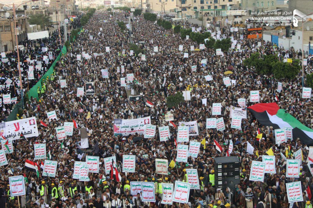 ورفعت الحشود الجماهيرية في المسيرات التي تعد الأكبر بالمنطقة العربية، الأعلام الفلسطينية واليمنية واللافتات والشعارات المنددة بجرائم الكيان الصهيوني ضد الشعب الفلسطيني ورفض التطبيع مع الكيان الصهيوني.