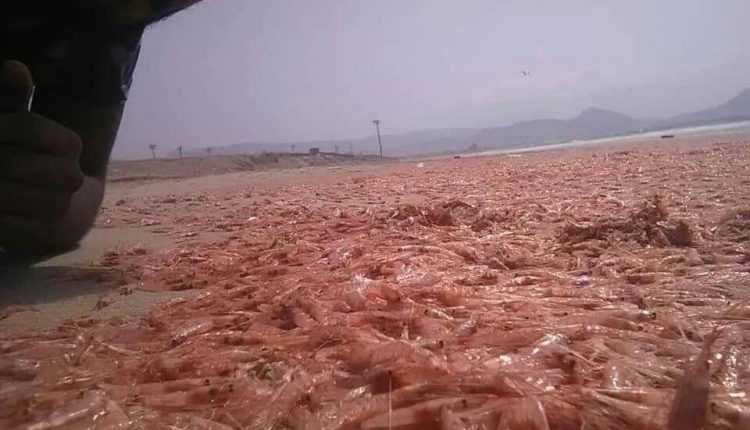 وتظهر الصور مئات الأطنان من الأسماك النافقة تتدفق على السواحل اليمنية، قذفتها أمواج البحر إلى سواحل حضرموت، واثارت هذه الظاهرة استغراب الكثيرين، وكيف أصبح الجمبري “الروبيان”، الباهظ الثمن، يكسو بلونه الوردي رمال شواطئ المكلا.. وأوضحت المصادر أن السكان لم يجرؤ أحد منهم الاقتراب من هذا “الكنز النافق” وتحاشوا تناوله خشية السبب المميت الذي أدى لقتلها.