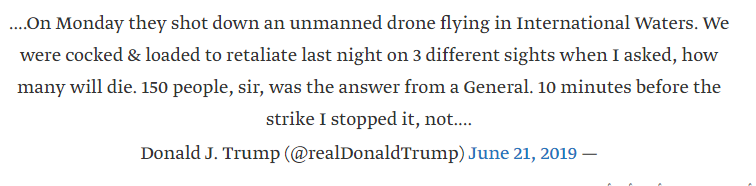 وفي سلسلة تغريدات يوم الجمعة شرح ترامب كيف قرر إلغاء ضربة عسكرية كان من المزمع توجيهها لإيران حسب ادعائه ردا على إسقاط طهران طائرة أميركية مسيرة.