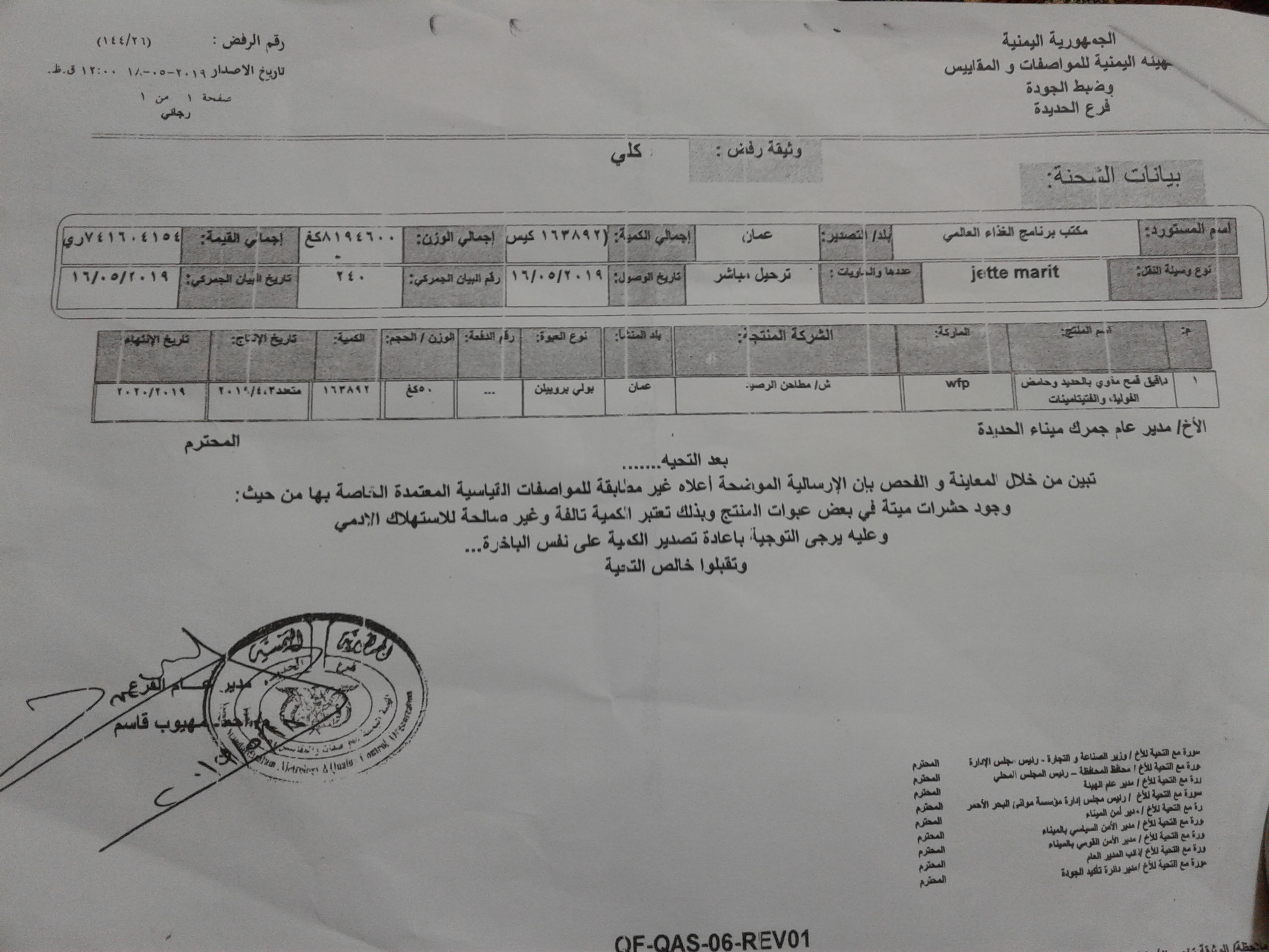 في عام 2019 تم رفض 163892 كيس دقيق جميعها تتبع منظمة الغذاء العالمي ولذلك تم اتخاذ الإجراءات الحاسمة والرادعة في هذا الجانب.